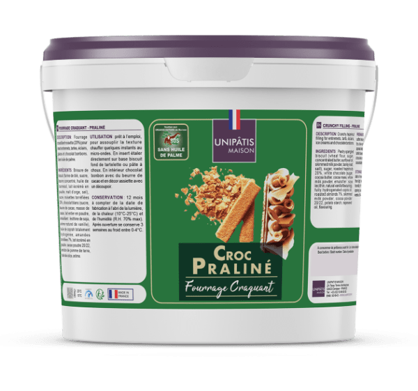 Non-hydrogenated copra formulation offering excellent value for money without compromising taste. The generosity of the almond-hazelnut praline (27% roasted nuts) guarantees an authentic, gourmet flavor. A creamy, easy-to-spread texture for fast, efficient use. Ready to use, this crunchy filling enhances your creations by playing on contrasting textures: airy mousse, soft cookie and crunchy insert. Excellent resistance to freezing and deep-freezing, retains its crispness perfectly.