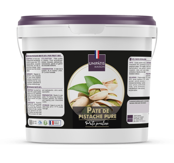Ready to use. Incorporate hot or cold using a premix. For 1 kg of buttercream or crème pâtissière, incorporate 80 to 100g of pistachio paste. For cold use in buttercream: incorporate pistachio paste as a premix using a triangle or horn.