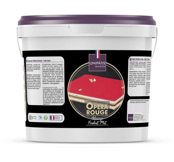 Ready to use. Melt at 45° / 50°C in a water bath or in a microwave oven in defrost mode. Spread with a spatula, smoothing with a single movement of the palette knife, or pour onto the frozen dessert (without frosting)