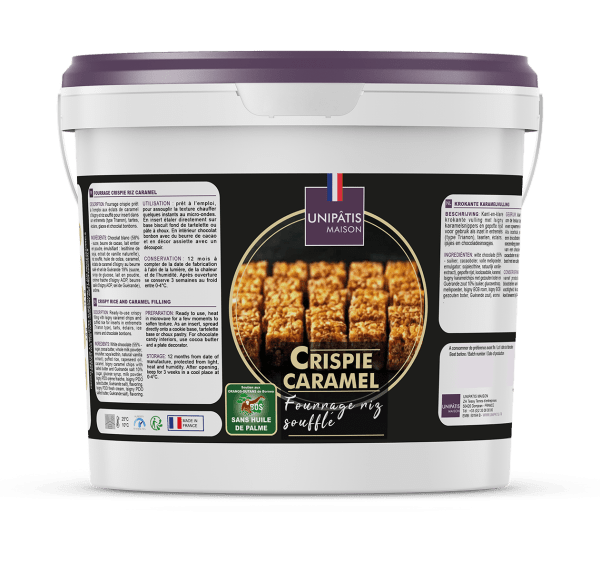Umplutură de orez pufos crocant, caramel și couverture de ciocolată albă cu unt de cacao pur, cu o atingere de ulei de rapiță pentru a înmuia textura.